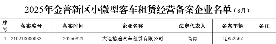 金普新区交通运输局:2025年金普新区小微型客车租赁经营备案(8月)