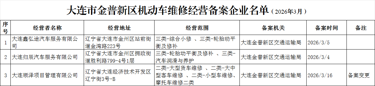 大连市金普新区机动车维修经营备案企业名单(2026年3月)
