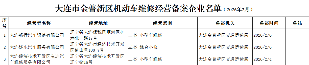 金普新区交通运输局:大连市金普新区机动车维修经营备案企业名单(2026年2月)