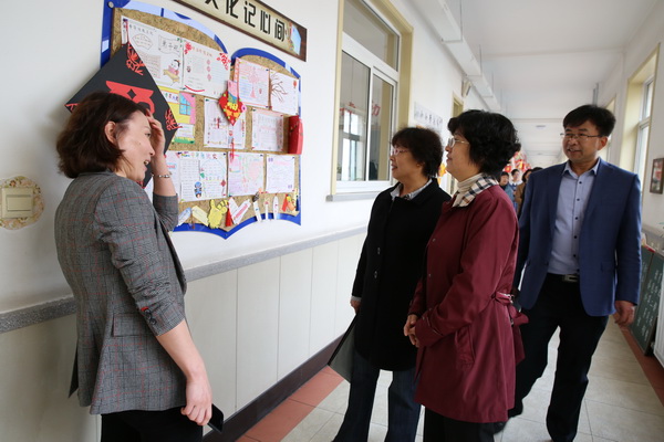 首先,领导们实地调研了实验小学校园文化建设情况,对学校在宣传和推广语言文字工作方面给予了高度评价。随后,宫学莉局长从区域语言文字工作进展情况、工作推进过程中存在的问题和困惑以及下一步的工作思路三大方面向市语委的领导做以汇报。然后,实验小学张爽主任汇报了学校语言语文工作推进情况,对学校语言文字制度建设、文化建设和校园活动的开展做了详细的介绍。最后,市语委陈德京主任同与会领导亲切的交流。她充分肯定了区域和学校在语言文字达标建设工作的阶段成果,认为我区语言文字工作扎实,特色鲜明,成效显著。同时,陈主任传达了省语委新的工作精神,分析了新时代语言文字工作面临的新形势,新任务,新要求,对区域今后语言文字工作的督导、创新、普及等方面提出了宝贵的意见和建议。