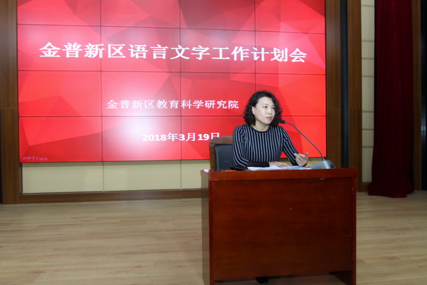 金普新区教育科学研究院组织了本次会议。会议由科研部语言文字工作王晶老师主持。会上解读了金普新区2018年度语言文字工作推进计划,对学校语言文字工作如何开展和推进做了详细的说明,尤其对学校、幼儿园语言文字工作的机制建设、制度建设、环境建设、培训宣传等内容做了重点强调,使各单位专干对语言文字工作有了更加明确的认识,对区域语言文字工作的顺利开展起到了促进作用。本次语言文字工作推进计划会还对各校的语言文字档案建设、考核评估以及围绕语言文字推进工作即将展开的对基层学校调研等事宜做了统筹部署,对今年上半年举办的国家普通话测试工作也做了相应的要求。