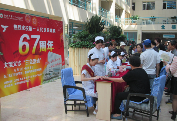 6月1日是金州区第一人民医院建院67周年纪念日。区一院与金州区人民风雨同舟67载,时刻关心老百姓健康,为了以实际行动回馈社会,落实惠民利民政策,今天上午区一院在向应公园开展大型义诊活动,由内科、外科、儿科等相关学科专家进行义诊,在现场为全区百姓进行常见病、慢性病的咨询,同时医院自6月1日——6月3日免三天门诊挂号费、血糖与血脂检测费用。金州区第一人民医院全体职工祝全区人民身体健康!