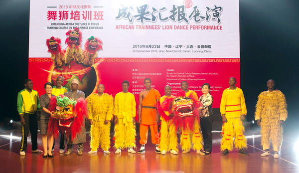 “2016中非文化聚焦•舞狮培训班”由文化部外联局、辽宁省文化厅主办,大连市文化广播影视局、金普新区社会事业局及金普新区文化馆共同承办,这也是金普新区继2015年培训贝宁和毛里求斯学员后,连续第二年承办此次活动。在为期5周的培训中,来自津巴布韦和尼日利亚的10名非洲学员表现出强大的精神动力,他们不怕苦、不怕累,勤学苦练,用短短一个月的时间掌握了旁人要花6个月才能学会的基本功和套路动作,成功出色的完成了本次展演,他们逼真的造型,超群的技艺,赢得了全场观众最热烈的掌声。结业仪式上,极具地域特色的国家级非物质文化遗产项目金州龙舞、市级非物质文化遗产项目马桥子太平鼓舞进行了展示和交流,与此同时,播放了“中非文化聚焦•舞狮培训班纪录片”,举办了“中非文化聚焦•舞狮培训班纪实摄影展”。