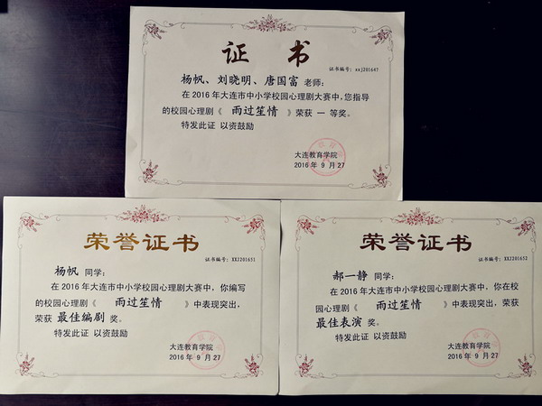 9月27日,在大连市第六届中小学校园心理剧展示大会上,由开发区八中杨帆老师、刘晓明老师、唐国富老师指导的心理剧《雨过笙晴》荣获大连市心理剧大赛高中组一等奖,高二(2)杨帆同学获得高中组最佳编剧奖、高三(6)班郝一静同学获得高中组最佳表演奖。