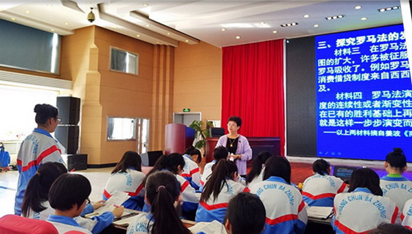 开发区八中历史特级教师陈志弘老师作为东北三省四市名师代表于9月29日展示了一堂高品质的高三一轮复习示范课—《罗马法》。课上,陈老师凭借先进的教学理念,渊博的学科底蕴,娴熟的教学功底,丰富的教学经验,迅速调动了长春八中学生的积极性,师生配合相得益彰。在陈老师的引领下,学生进行了高质量的小组合作探究,课堂气氛活跃,并引起了全场师生多次热烈的掌声。陈老师的展示课,充分彰显了开发区八中“一核双五”教学模式的精髓。展示课过后,各校名师给予高度评价,纷纷上前交流探讨。