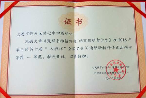 开发区七中喜获“人教杯”全国名著阅读经验成果展辽宁省一等奖