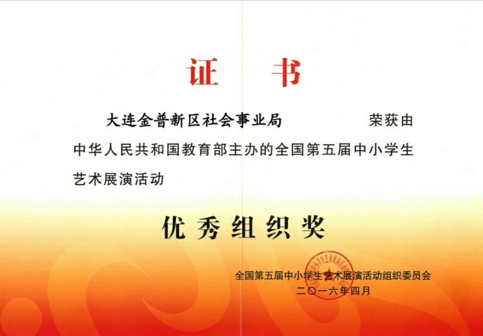 在“全课程育人与学生核心素养提升”主题年精神指引下,金普新区社会事业局继2015年荣获辽宁省教育厅颁发的“辽宁省第五届中小学生艺术展演活动优秀组织奖”的基础上,2016年再攀高峰——中华人民共和国教育部授予辽宁省大连金普新区社会事业局“全国第五届中小学生艺术展演活动优秀组织奖”。