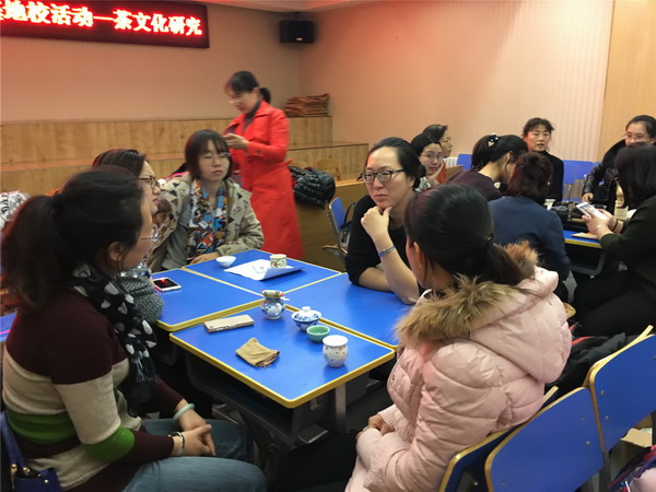 活动中,研训员樊老师和阎老师针对核心素养与课程开发进行了理论讲座,然后由专业茶艺师进行“行茶十式”的实践培训,最后老师们边品茶,边交流《茶文化》主题活动的研究成果。一壶清茶,沏出浓浓的感悟;一杯在握,芬芳绕指,在茶香四溢的活动现场,感受茶文化在我国有着源远流长的深厚涵义的同时,老师们从我说起,从现象出发,从能够改变的地方开始,品茗聊教育。