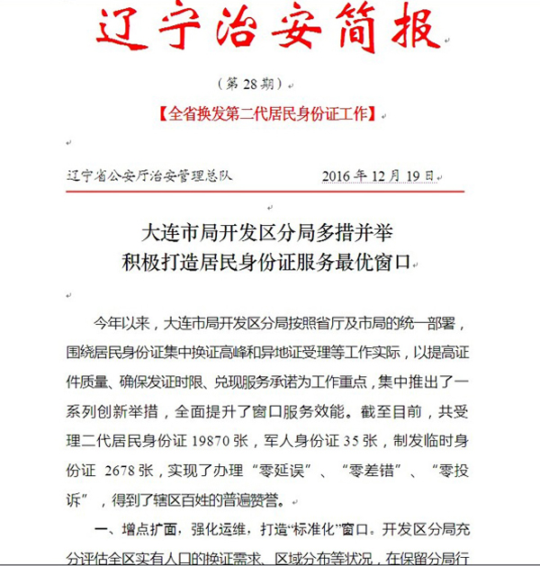 近日,省公安厅治安总队第28期《辽宁治安简报》刊发了《大连市局开发区分局多措并举,积极打造居民身份证服务最优窗口》的经验材料,对开发区公安分局居民身份证服务工作的成功做法予以肯定。该局推出的居民身份证照片“多拍优选”创新举措,做为全省居民身份证受理窗口建设标准规定予以推广应用。