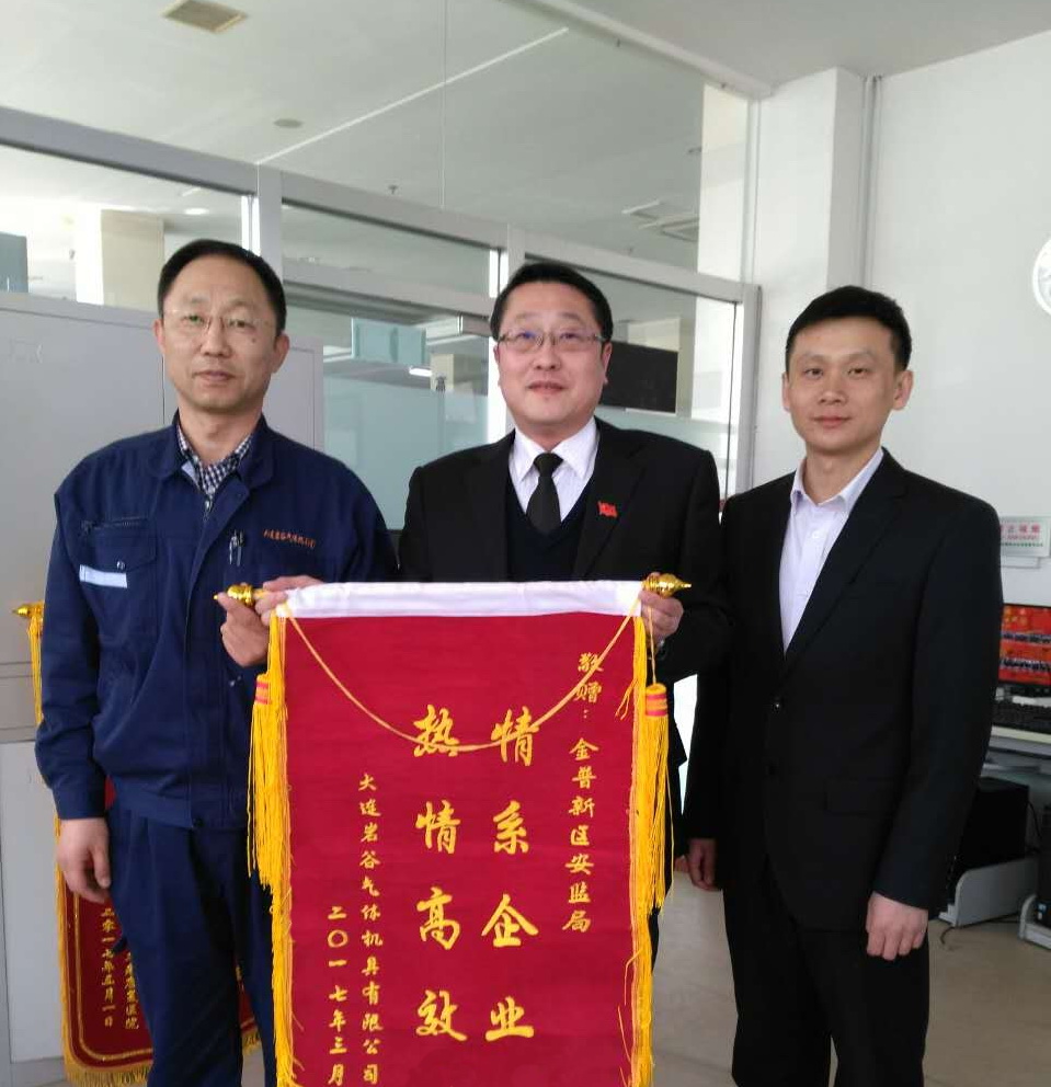 2016年3月20日,大连岩谷气体机具有限公司负责人给金普新区安监局行政审批处(行政服务大厅安监局窗口)送来一面锦旗,感谢工作人员高效热情的服务为企业的发展提供便利条件。