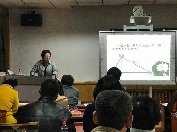 韩春蓉老师精心的设计了辅导方法和流程。培训前韩老师先对老师们进行了试卷测试,接着针对老师们的试卷出现的问题,进行了五年级教材辅导,她把全册教材先按照知识结构进行梳理,从整体上让老师把握知识点,进行教材通览。然后,韩老师按照教材课程编制的顺序逐课进行整理和分析,首先是研究教材的知识点,详细的整理出单元教学的概念和分解到每一节课的小概念,如何搭设桥梁让学生探究学习概念,针对教材设计的教学环节,作为教学的组织者,如何处理这些教学内容,更让教师们受益匪浅的是,韩老师对某些教学设计的修改和创新,更能让参与的老师感觉耳目一新,非常适合教学。最后,韩老师又详尽的介绍了教学中应该注意的相关问题,尤其是对知识的把握上,有哪些难点和模糊不清的问题,作为教学的组织者都应该心中有数,以防在今后的教学中出现不应该出现的问题。