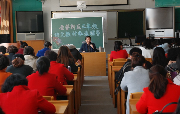 今年的教材培训按照区域重新划分的基地校分片进行,每个年级设三个会场,分别是石河小学、高城山小学和春华小学。三所学校的领导和教师做了大量的会前准备工作。教育科学研究院小学语文研训员马凤明老师全程组织和主讲,全区近400名本年段语文教师参加了培训。
