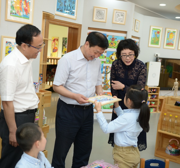 王强书记在新区管委会副主任宋振民、两委办主任赵东、组织部部长丛军、宣传部部长柳金红、社会事业局局长高奇志、马桥子街道党工委书记车民选等领导的陪同下来到开发区新桥艺术幼儿园。一进大门,王强书记和随行领导们就与幼儿园教师们一一握手,表示亲切慰问。在 “庆六一”亲子游园活动现场,王强书记和随行领导们亲切地向小朋友们招手问候,并向部分儿童赠送了智力玩具、学习用品等精美的节日礼物。随后,王强书记一行参观了新桥幼儿园的教学设施和园所文化,兴致勃勃地观看了小朋友们表演的节目。王强书记在参观中与幼儿园教师们亲切交谈,详细询问了孩子们学习、就餐、午休以及在园安全等情况。王强书记对新桥幼儿园园舍条件、教育环境和日常管理等都给予了充分肯定,他勉励老师们牢记使命,爱岗敬业,主动适应区域创新发展大势和教育改革发展形势,为金普新区新一轮发展振兴做出更大贡献。