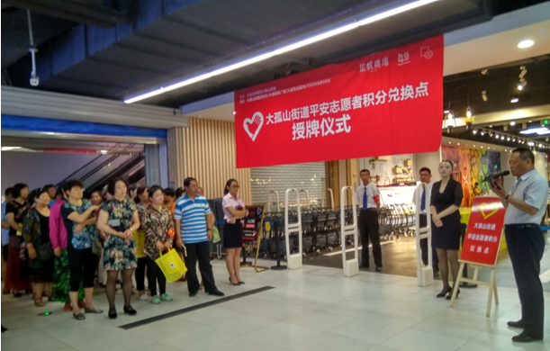 6月29日上午,大孤山街道平安志愿者积分兑换项目启动仪式在银帆广场每当超市举行。大孤山街道综治办副主任、银帆广场经理、每当超市经理、社区工作人员、治安防范员、平安志愿者等300余人参加了此次揭牌仪式。