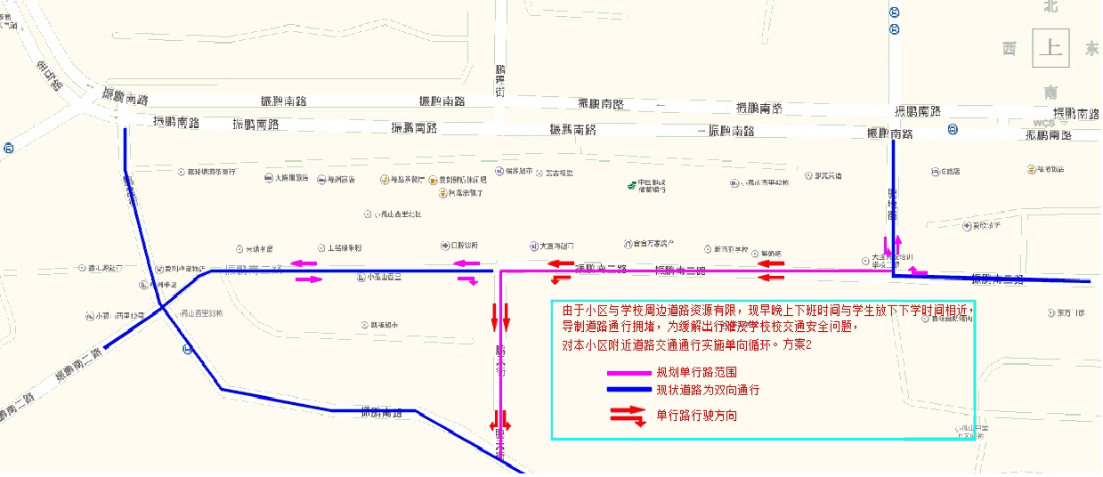 由于绿洲半岛小区与滨海小学周边道路资源有限,早晚上下班时间与学生上放学时间,道路交通拥堵严重。为缓解学校门前交通拥堵的情况,开发区交警大队决定将振鹏南二路(鹏地街至鹏天街)路段及鹏天街的通行方式改为单向通行。通行方式为:振鹏南二路(鹏地街至鹏天街)路段为由东向西通行,鹏天街为由北向南通行(后附交通规划图),道路标志标线设置完毕后即开始执行。
