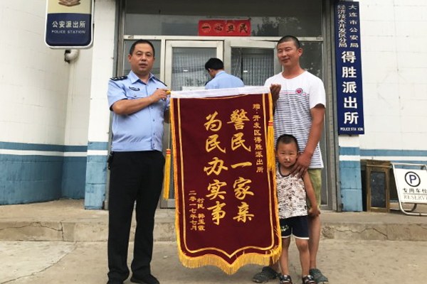 7月17日,孩子家长丁某给得胜派出所民警送来了一面“为民办实事,警民一家亲”的锦旗,表达感激之情。