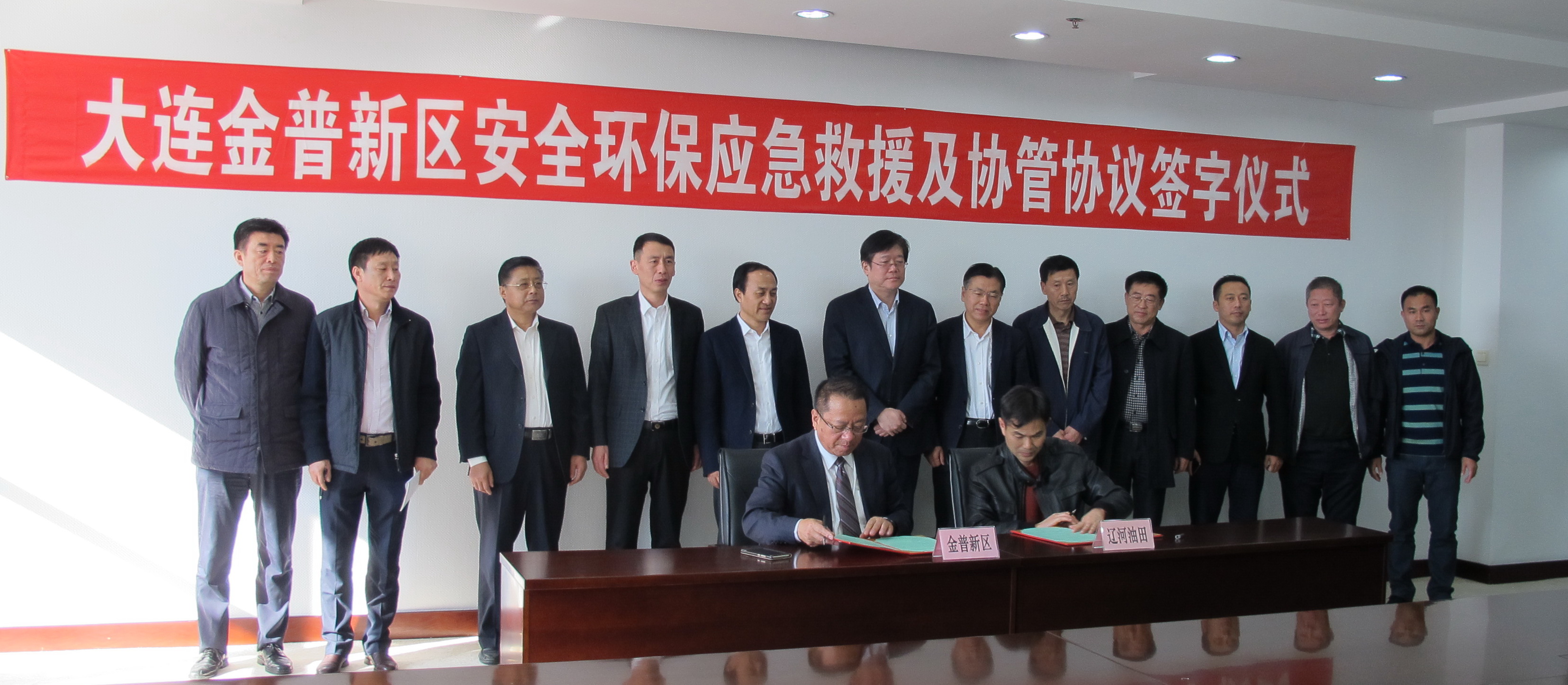 揭牌仪式前,金普新区管委会与中国石油天然气股份有限公司辽河油田分公司举行座谈交流会,就危险化学品车辆停车场、安全环保应急实训基地、危废处理等事项进行了商谈;金普新区安监局与辽河油田金宇环保工程有限公司(辽河油田溢油应急处置中心)签署金普新区安全环保应急救援及协管协议,成立应急救援中心为金普新区安全环保保驾护航。