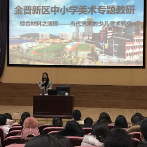 以金普新区中小学美术校本课联盟为联动的美术教研,开启了综合材料绘画研究的序幕。综合材料绘画,是界定现代绘画中那些非传统材料的绘画创作,在中小学美术教学中具有创新性意义。河南省美术馆特聘教师、河南省少儿美术教育专家邢佩老师以她多年对综合材料的探索和丰厚的教学实验经验,结合当代艺术的理解与转换,分享了当今前沿的少儿艺术的实践和教育理念。 以波普游戏、“迹象”系列案例、表现主义的新形式再现、真实繁杂的材料纹理的创造性实验、安塞姆•基弗的艺术与教学案例等,强调了当代艺术在儿童美术教育中的必要性与策略方法,为老师们带来新的课程思路与启发。邢佩老师又以绘本美术教学,介绍了她如何带领学生完成绘本作品以及理论原理。邢佩老师以她勤奋大胆的实践探索,毫无保留的传授征服了再坐的所有老师。