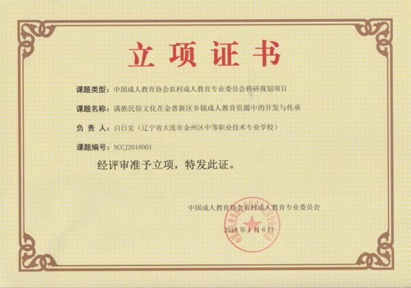 1月21日,金州区职教中心与七顶山职校共同主持的《满族民俗文化在金普新区乡镇成人教育资源中的开发与传承》课题被确定为国家级课题。