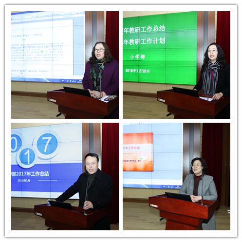 会议还进行了各部室工作总结与计划研讨,全院11个部室的主任用详实的素材、多样化的形式从不同侧面对各部门2017年的各项工作做了精彩的回顾,既梳理了工作亮点阐释了思考,又充分表达了新一年工作的展望和方向。教科院领导为荣获2017年学院奉献型、和谐型、创新型、进取型、研究型部室颁发了牌匾。教科院附属实验中学筹建办刘景钢主任、治平小学谷祖远校长应邀参加了会议。面对2018年金普新区教育发展新形势、新标准、新任务,教科院所有研训教师将立足于深化课程改革,立足于全课程育人与学生核心素养的提升,凭借主动服务意识、主动研究意识、主动合作意识、主动引领意识、主动学习意识、主动成果意识发挥促进区域教育改革、促进区域教育质量提升的重要作用,全力推进教育科学主体智库创新发展,为新区全面建设群众满意的教育事业砥砺前行。