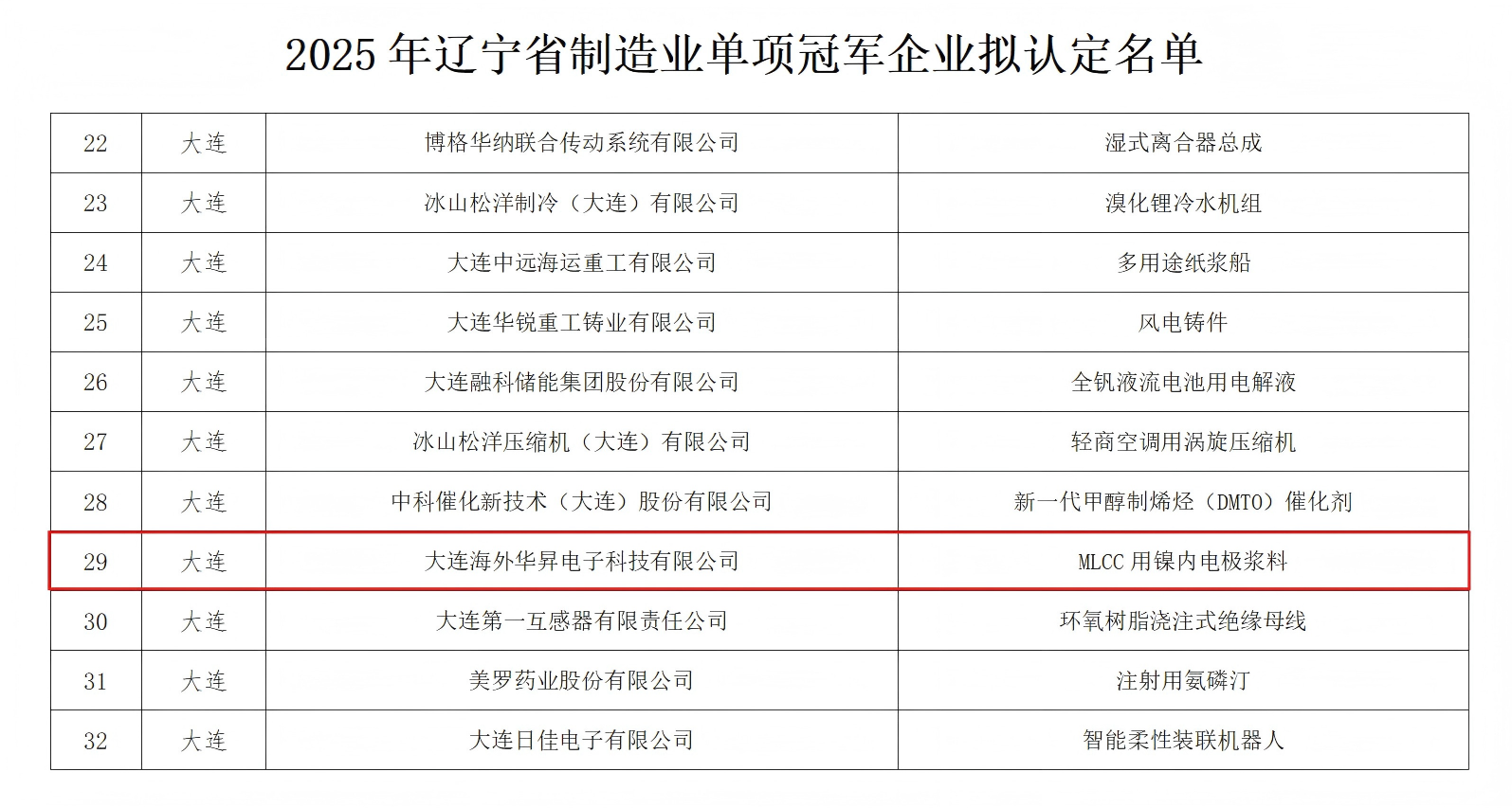 大连海外华昇电子科技有限公司是国内电子浆料行业领军企业,掌握行业领先的高精度微米/纳米级金属电子浆料核心制备技术,打破了国外厂商的长期垄断。企业产品作为电子工业关键原材料,广泛应用于消费电子、通讯、汽车电子、AI算力、半导体、新能源等战略性新兴产业领域。此项荣誉是对企业技术创新能力、市场占有率及行业领先地位的权威认可,更是对其长期深耕细分领域、带动产业链上下游协同发展所取得成绩的充分肯定。