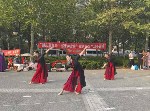 此次联欢形式多样、内容丰富,满是对祖国的深情热爱。伴随着激昂的音乐,12 人组成的社区舞蹈队率先登场,带来多人舞蹈,队员们身着鲜艳的演出服,手持牡丹花,以灵动的舞姿展现祖国的壮丽山河与繁荣景象,整齐的动作与饱满的情绪瞬间点燃现场,台下掌声此起彼伏;随后,社区中年搭档李女士与邵先生带来双人对唱,两人默契的配合、深情的演唱,引得台下居民轻声跟和;最令人惊喜的是社区退休居民组成的10 人演奏团队,他们手持二胡、古筝、竹笛等传统乐器,悠扬的乐声萦绕广场,不少居民随着旋律轻轻点头,沉浸在浓浓的爱国情怀中。