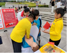 除心肺复苏实操体验外,活动现场还通过宣传展板、知识手册等载体,同步普及应急救护与“三献”(无偿献血、捐献造血干细胞、捐献人体器官)知识。色彩鲜明的展板以漫画形式,展示了气道异物梗阻急救(海姆立克法)、常见外伤处理等实用技能;发放的宣传册则详细介绍“三献”的政策流程、健康要求及社会意义。不少居民驻足翻阅手册,向现场志愿者咨询无偿献血适宜年龄、造血干细胞捐献影响等问题,志愿者均耐心逐一解答。