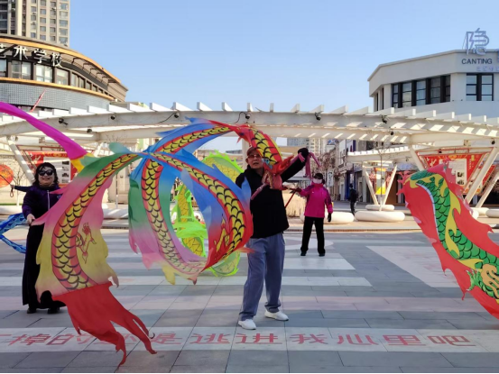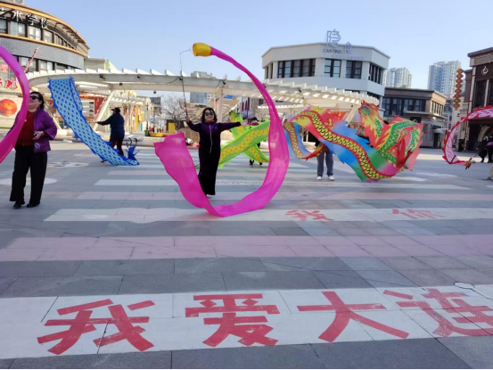 参与舞龙的居民中,既有经验丰富的“老把式”,也有初次尝试的爱好者。大家伴随着轻快的节奏,默契配合、步调一致,将龙的精气神展现得淋漓尽致。挥舞间,不仅锻炼了身体,更传递出团结协作、昂扬向上的精神风貌。广场地面上,“我爱大连”暖心标语与飞舞的祥龙相映成趣,既彰显了城市温度,也让传统文化与现代生活完美融合。