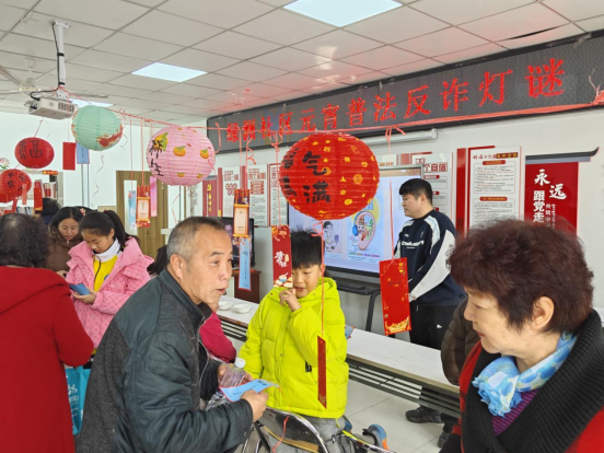 活动现场张灯结彩,在挂满灯笼的活动室内,数十页灯谜悬挂半空,与传统字谜不同,这些谜题的内容格外 “接地气”。“‘馅饼’从天降,汇款要提防(打一诈骗类型)”“拾得遗失物,索要高报酬(打一法律常识)”…… 一条条将电信网络诈骗手段、民法典新规、各类普法知识融入谜面的谜题,既保留了传统灯谜的趣味性,又兼具了普法宣传的实用性。