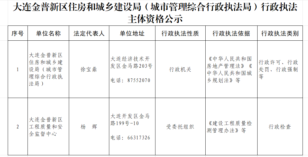大连金普新区住房和城乡建设局(城市管理综合行政综合执法局)行政执法主体资格公示