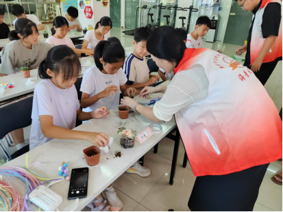 随后,小志愿者们参与 “清洁家园” 行动,分组清理小区绿化带垃圾、擦拭公共设施。学生们的互动环节尤为亮眼:他们先在社区准备的白色帆布包上,用画笔和颜料绘出心中的绿色家园;更将废旧塑料水瓶变废为宝,用剪刀仔细修剪瓶身,贴上小毛球、系上扭扭棒,亲手制作成别致的小盆栽花盆,再装入营养土、栽上多肉幼苗,一个个充满创意的环保盆栽就此诞生。