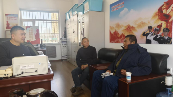 街道服务站站长黄文忠同志(中)接待来访老兵