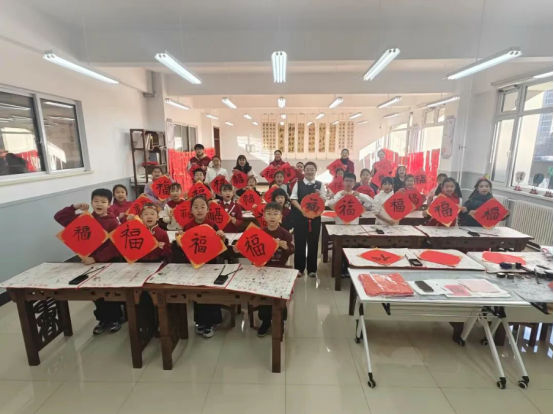 活动中,春和小学邀请大连大学马静婷主任现场挥毫泼墨,带领鹏达社区工作人员和在校师生一同体验书法的独特魅力。马主任耐心指导握笔、运笔要领,笔墨飘香间,一个个“福”字跃然纸上。