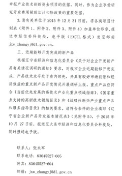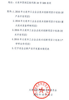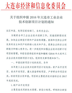 根据大连市经济和信息化委员会的指示精神,现对2016年工业企业技术创新项目计划情况进行申报,请各街道负责同志组织企业按市通知要求申报,并于12月20日下班之前将本辖区内企业计划表和电子版送至技改处。