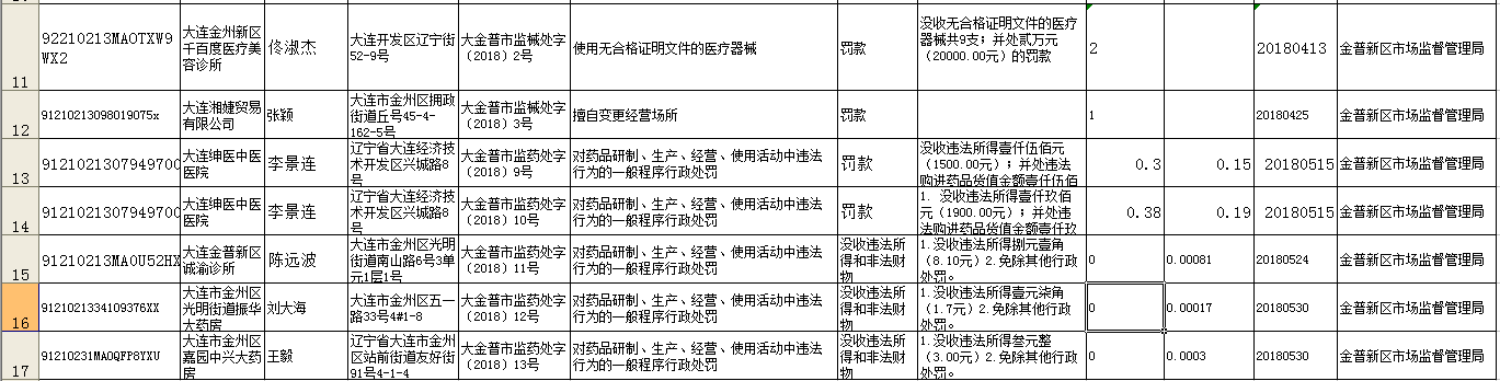 大连金普新区市场监督管理局案件公示表
