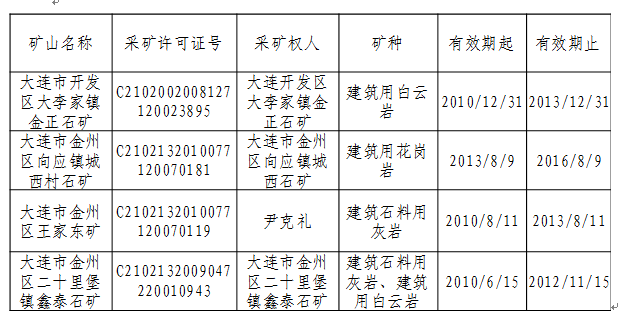 根据《矿产资源开采登记管理办法》(国务院令第241号)第七条、《国土资源部关于完善矿产资源开采审批登记管理有关事项的通知》(国土资规【2017】16号)和《关于深入贯彻落实新发展理念全面实施非煤矿山综合治理的意见》(辽委发【2018】49号)的有关规定,以下四家企业在采矿许可证有效期届满前未依法办理延续登记申请手续,现予以废止公告。采矿权基本信息如下: