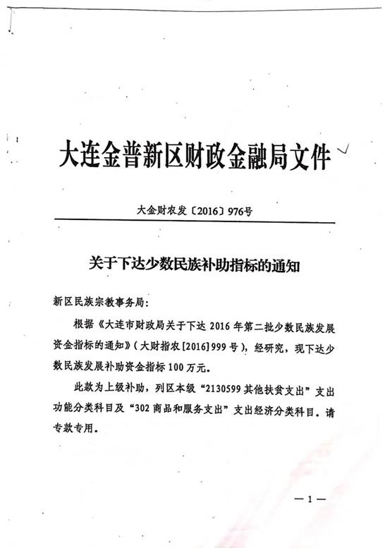 关于下达少数民族补助指标的通知