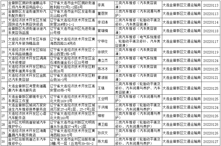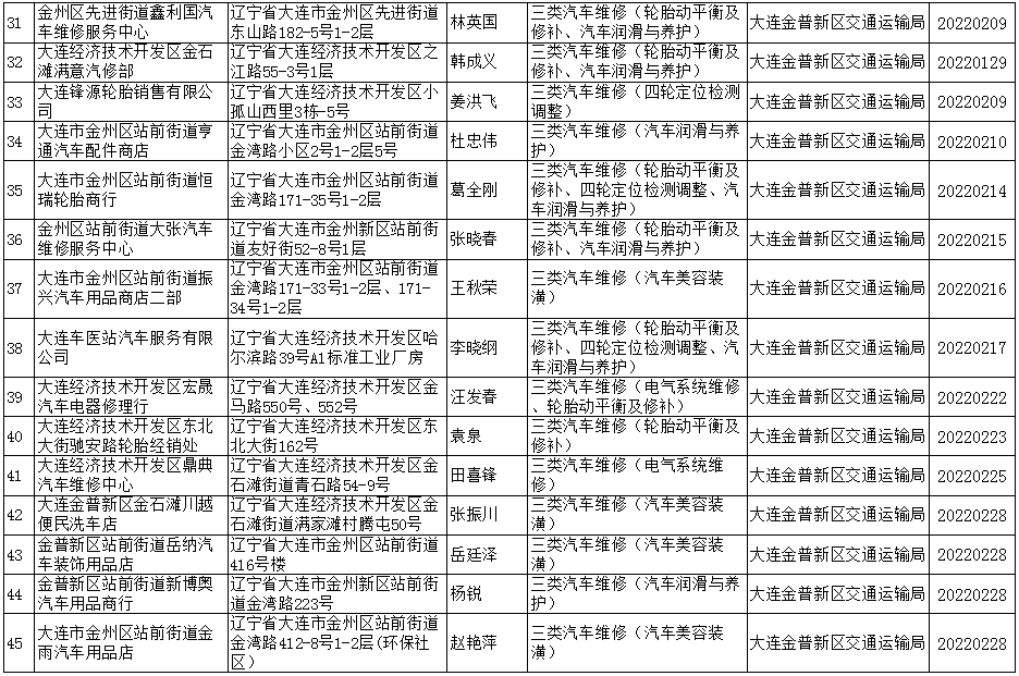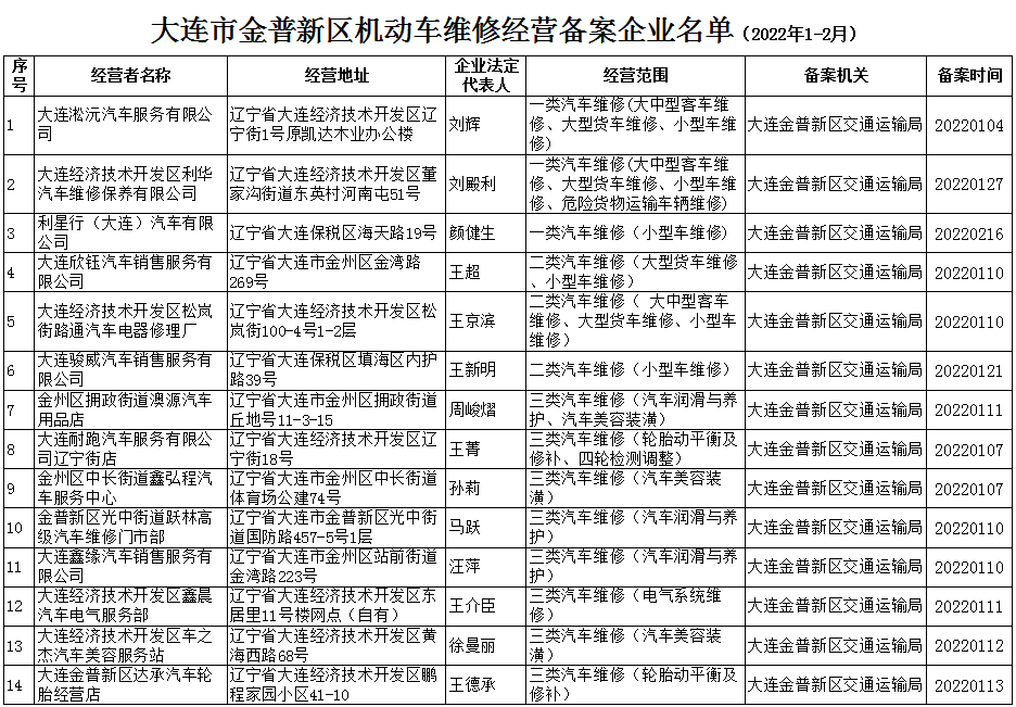 金普新区交通运输局:大连市金普新区机动车维修经营备案企业名单(2022年1-2月)