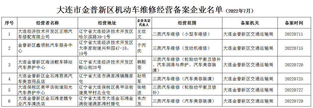 金普新区交通运输局:大连市金普新区机动车维修经营备案企业名单(2022年7月)