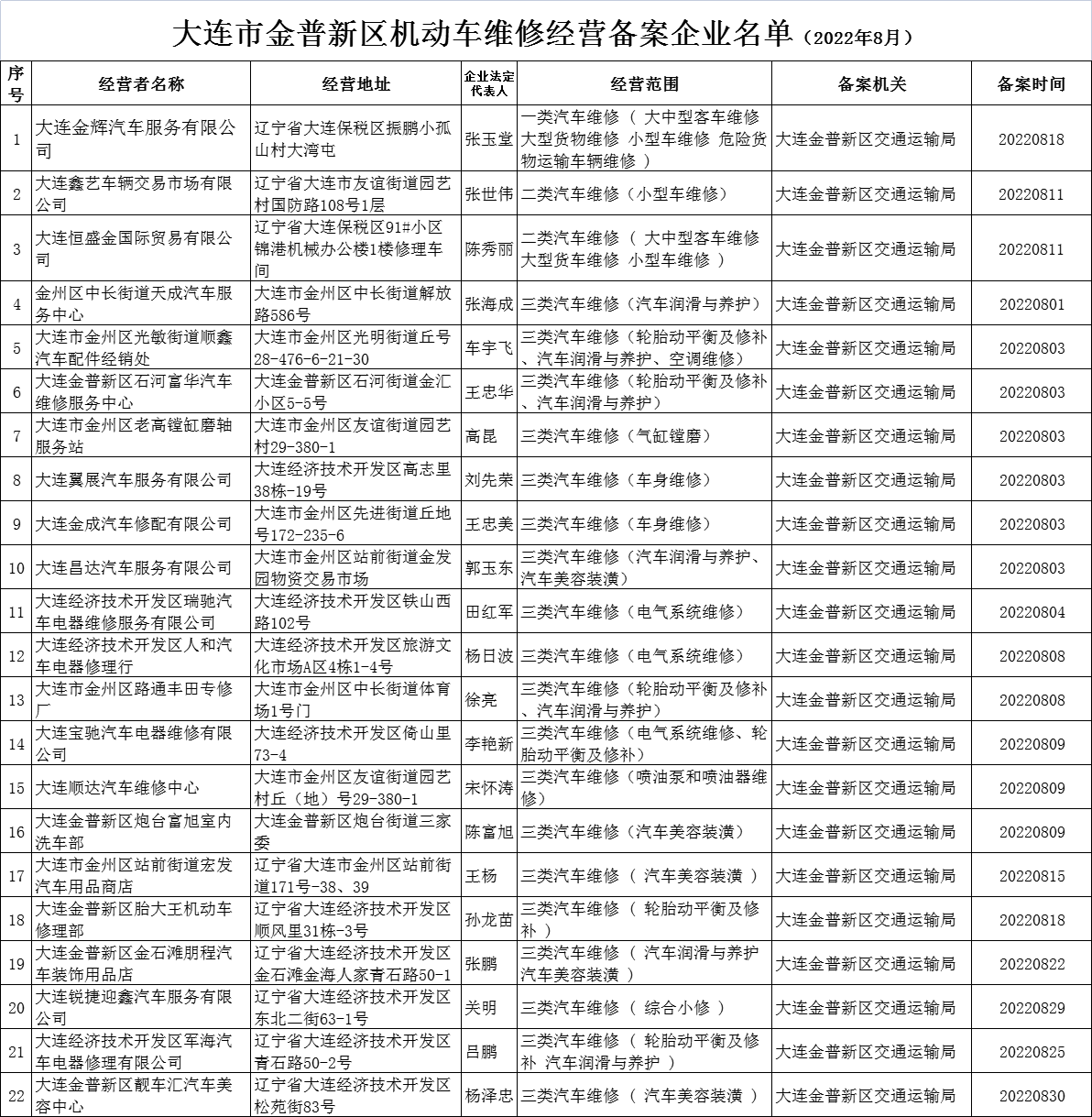 金普新区交通运输局:大连市金普新区机动车维修经营备案企业名单(2022年8月)
