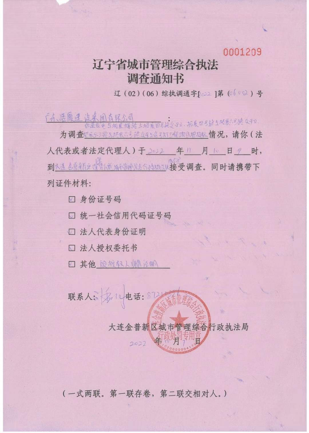 辽宁省城市管理综合执法调查通知书