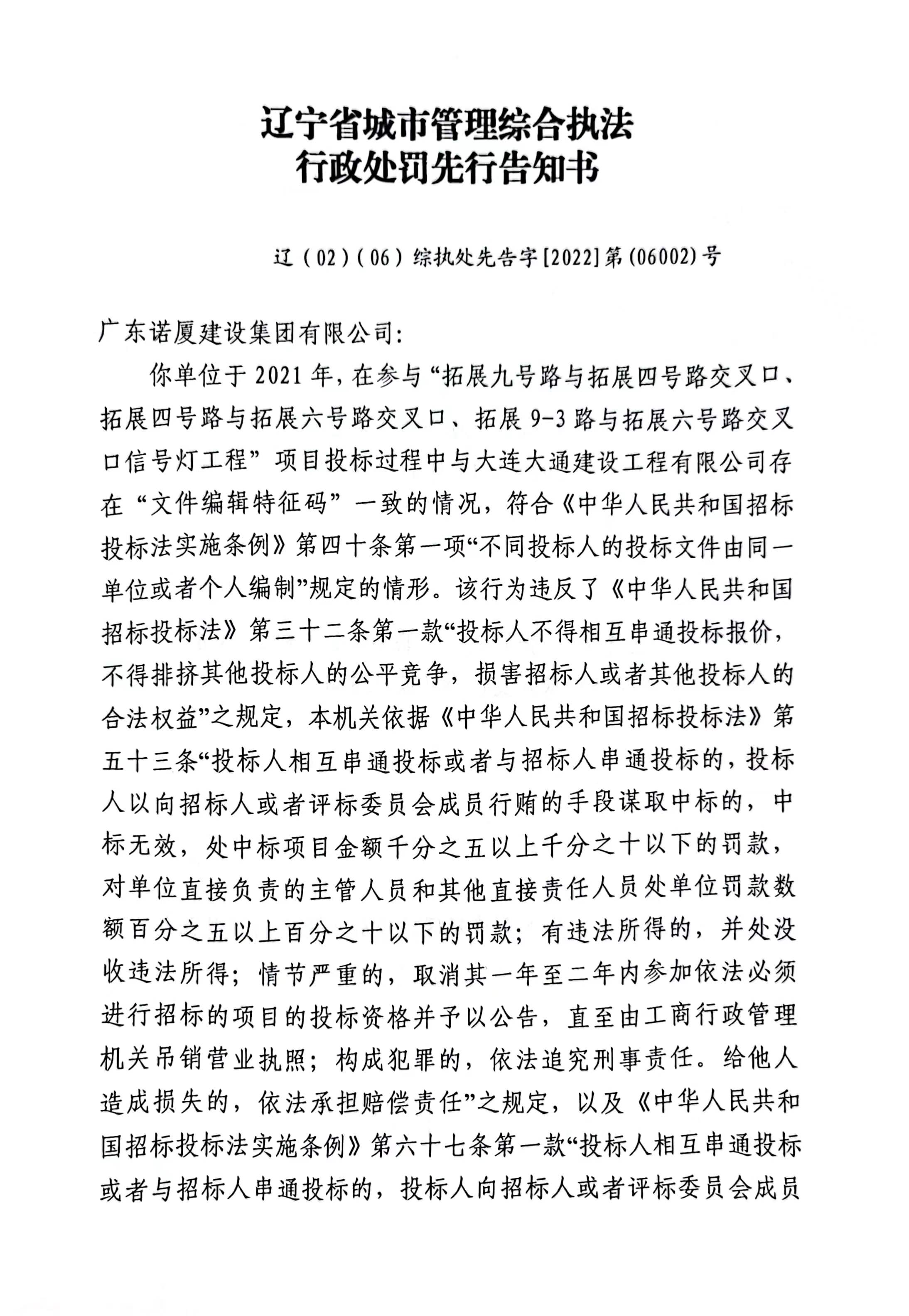 辽宁省城市管理综合执法行政处罚先行告知书——广东诺厦建设集团有限公司