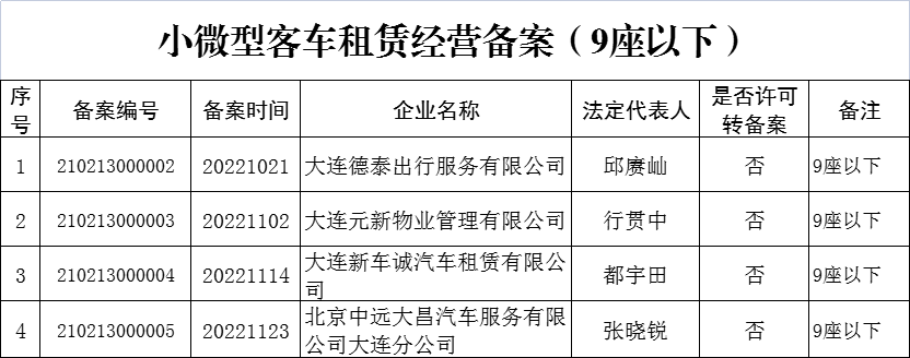 金普新区交通运输局:小微型客车租赁经营备案(9座以下)