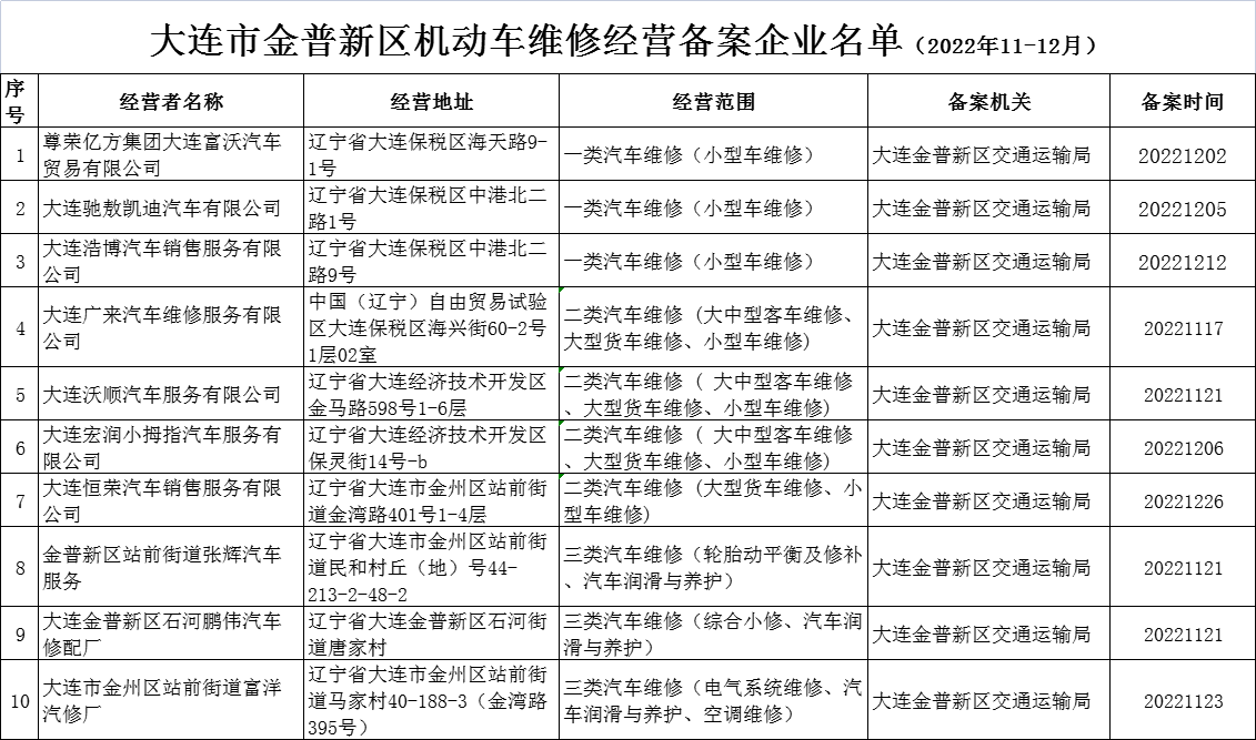 金普新区交通运输局:大连市金普新区机动车维修经营备案企业名单(2022年11-12月)