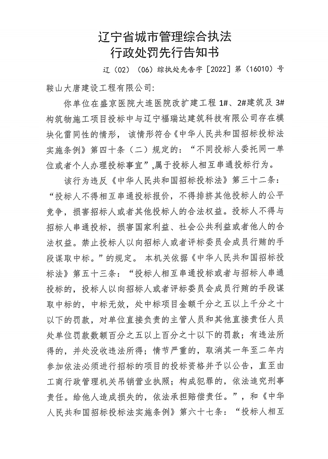 辽宁省城市管理综合执法行政处罚先行告知书--鞍山大唐建设工程有限公司