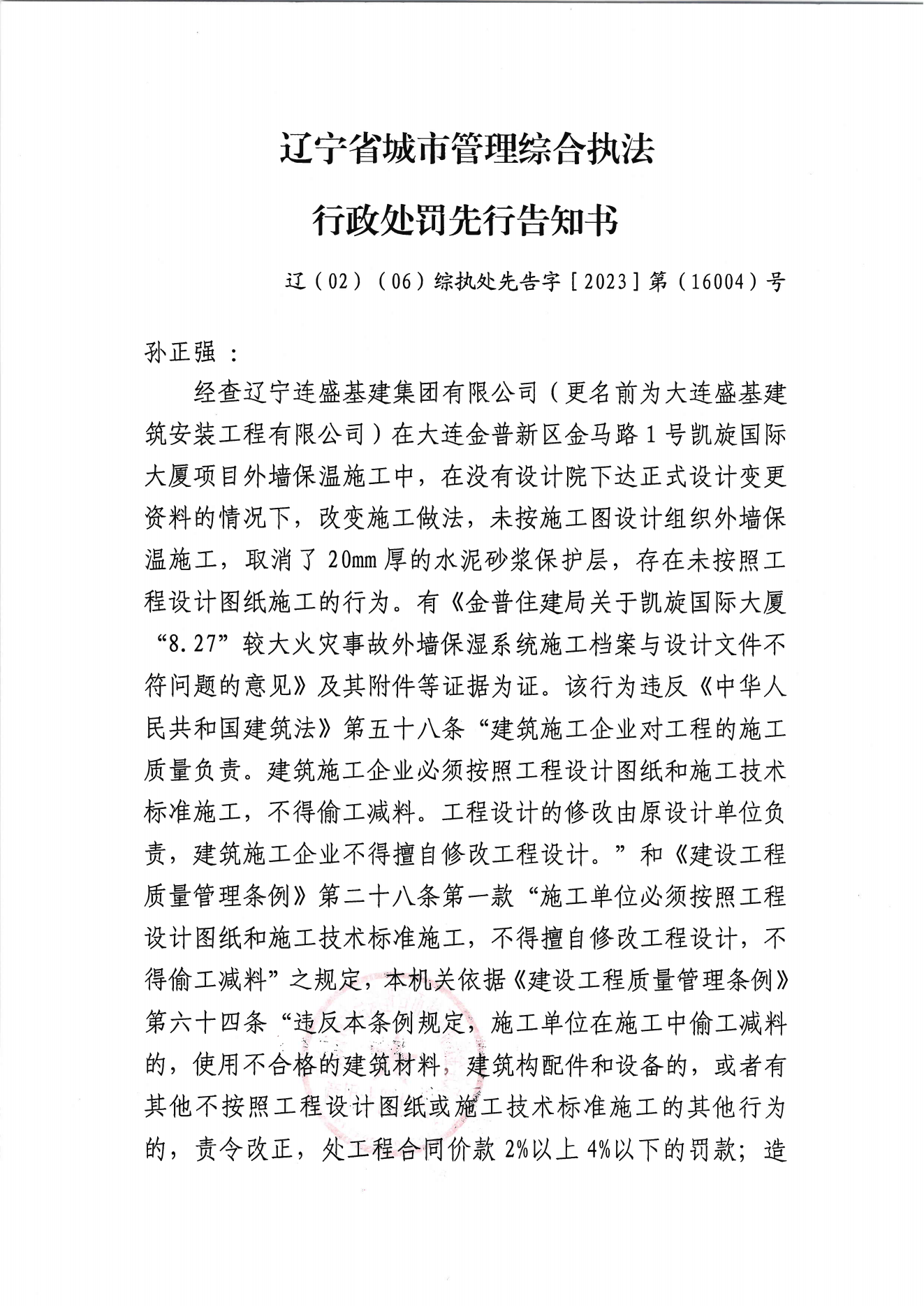 辽宁省城市管理综合执法行政处罚先行告知书--孙正强