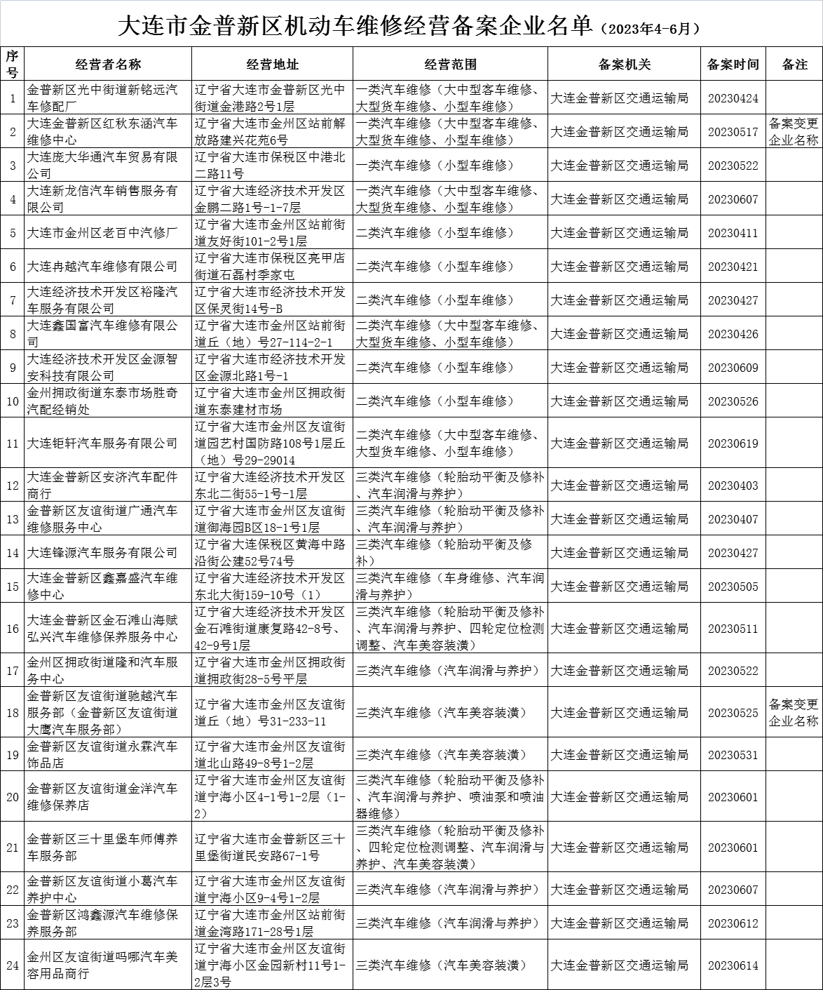 金普新区交通运输局:大连市金普新区机动车维修经营备案企业名单(2023年4-6月)