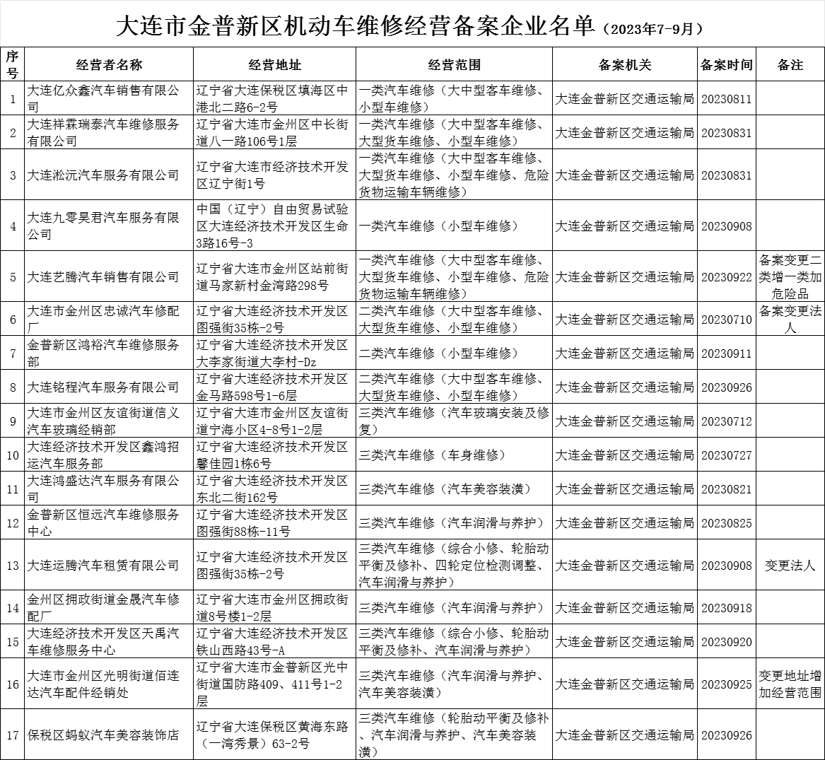 金普新区交通运输局:大连市金普新区机动车维修经营备案企业名单(2023年7-9月)