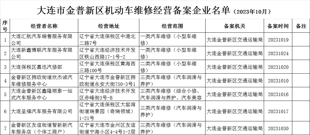 金普新区交通运输局:大连市金普新区机动车维修经营备案企业名单(2023年10月)