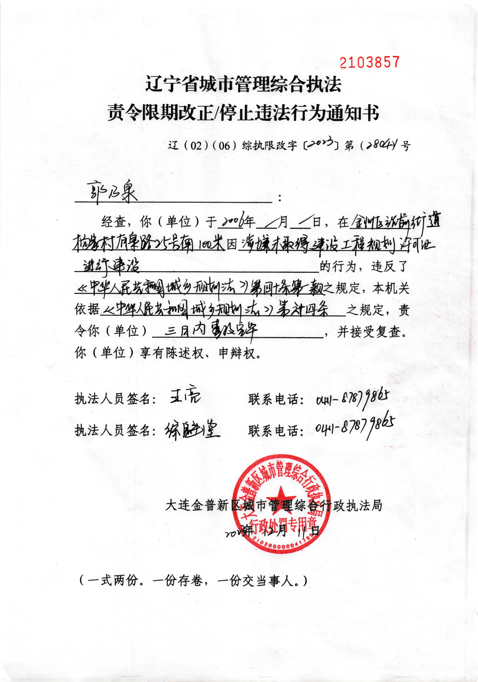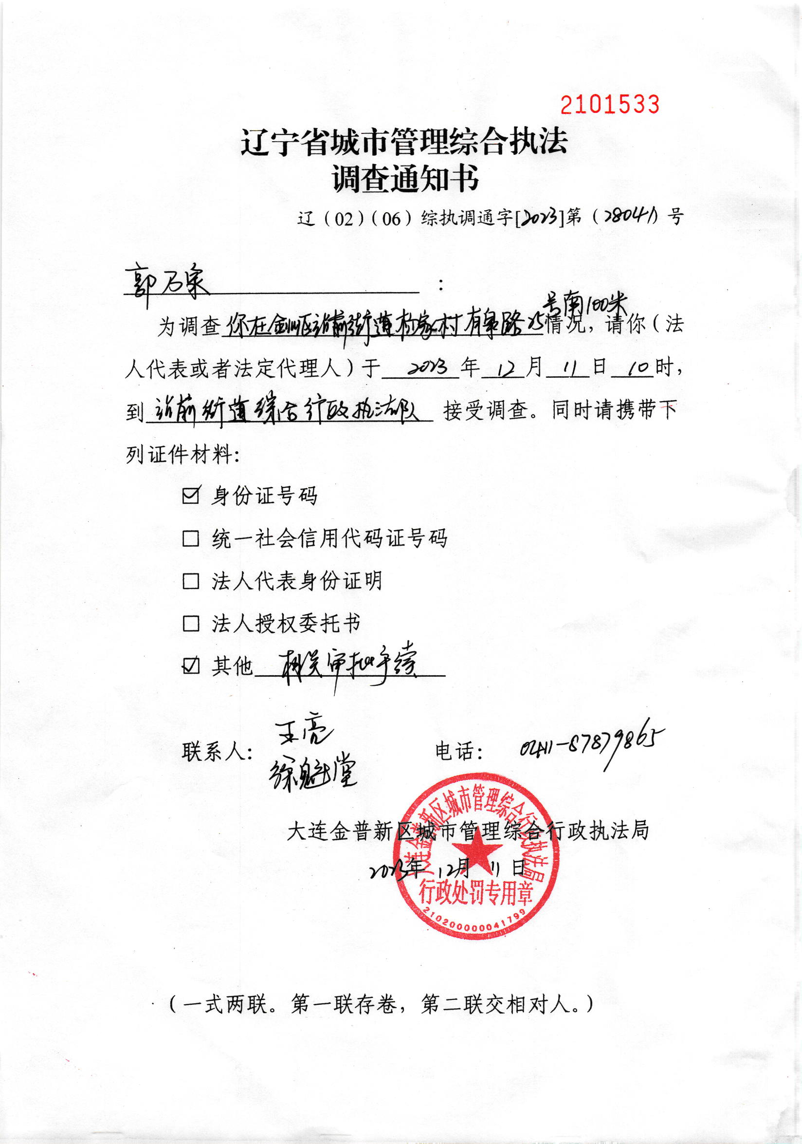 为调查你(单位)在金州区站前街道杨家村有泉路25号南100米涉嫌未取得建设工程规划许可证进行建设的情况,因无法以直接送达等方式进行送达,现依据《住房和城乡建设行政处罚程序规定》第三十六条、《中华人民共和国民事诉讼法》第九十五条向你(单位)公告送达辽(02)(06)综执调通字[2023]第28041号《辽宁省城市管理综合执法调查通知书》,经过30日即视为送达。请你自收到通知书之日起七日内携带身份证、其他相关审批手续材料到站前街道执法队接受调查。和《辽宁省城市管理综合执法责令限期改正/停止违法行为通知书》,责令你三日内整改完毕,经过30日即视为送达。